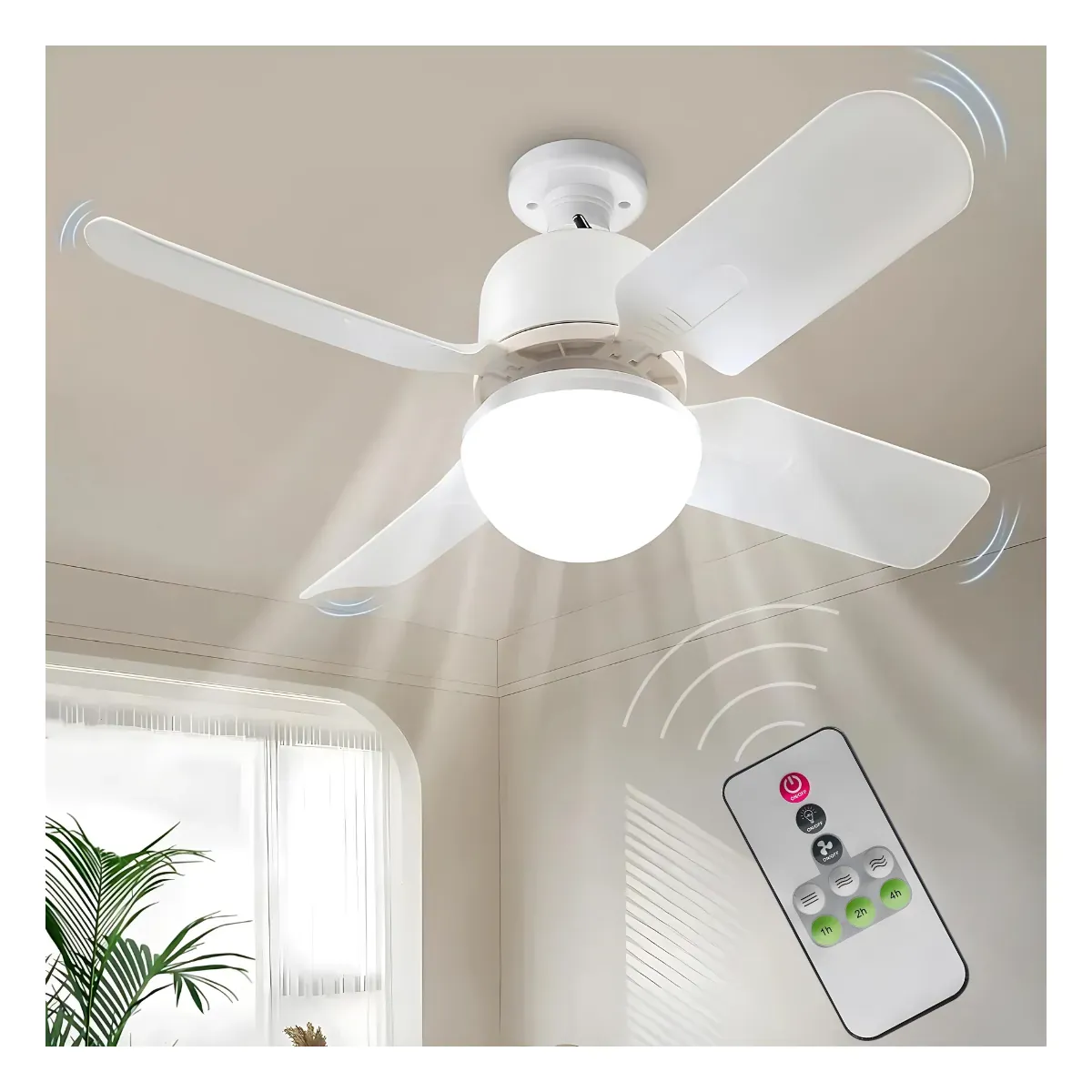 Esta lámpara abanico es perfecta para noches calurosas. Tiene 3 velocidades ajustables, bombillo de 24W y 1920 lúmenes. Incluye 4 aspas desmontables, temporizador de 1h, 2h y 4h, y control remoto para encender, ajustar velocidades y temporizador.