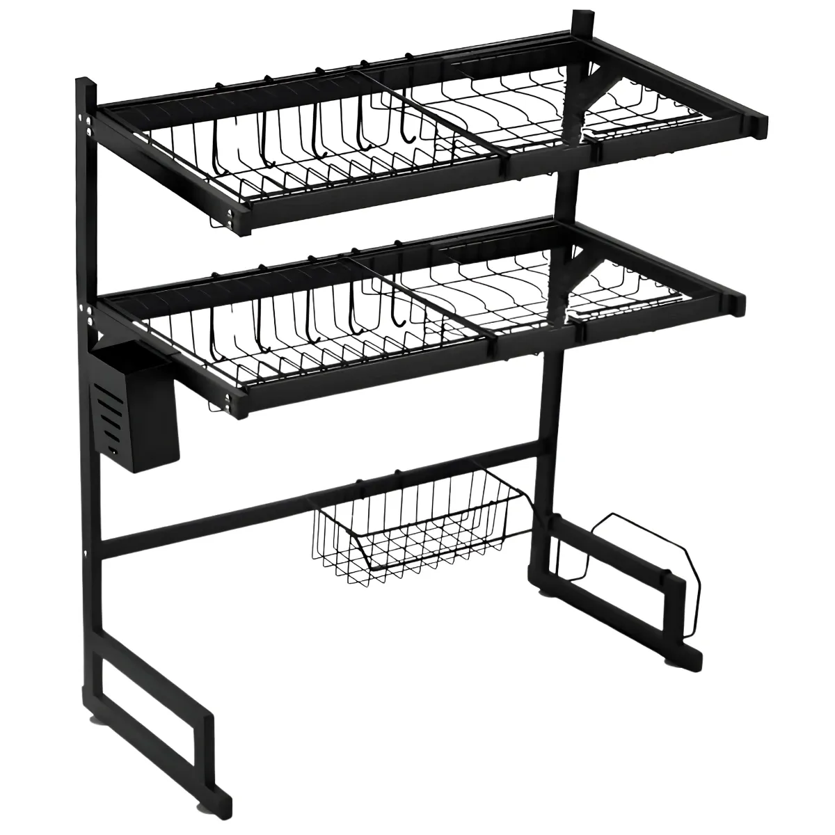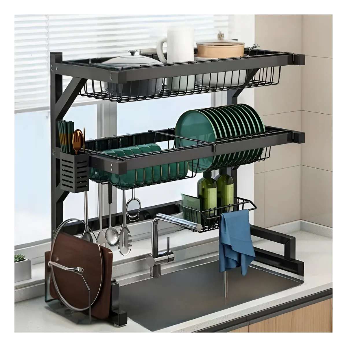 Organizador de 2 niveles para platos y tazas. Incluye soporte para cubiertos, canasta para jabón, ganchos para utensilios y espacio para tabla. Sus patas tienen mini ventosas que evitan movimientos.